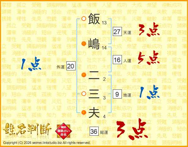 飯嶋二三夫さんの総運は36画の3点!