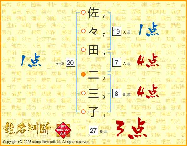 佐(7画)々(7画)田(5画) 二(2画)三(3画)子(3画)