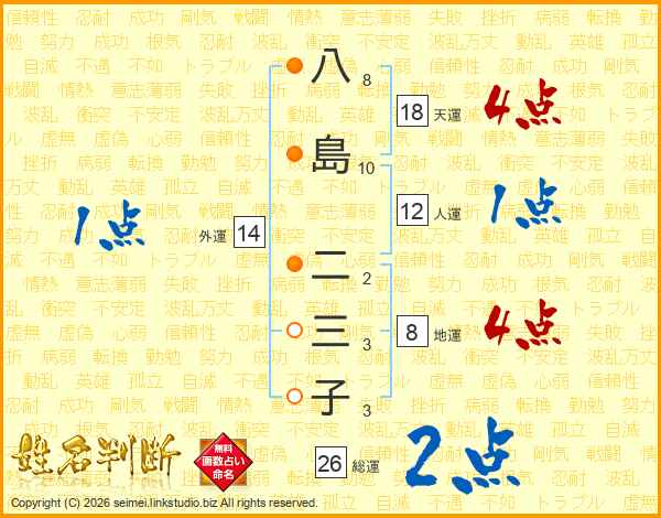 八(8画)島(10画) 二(2画)三(3画)子(3画)