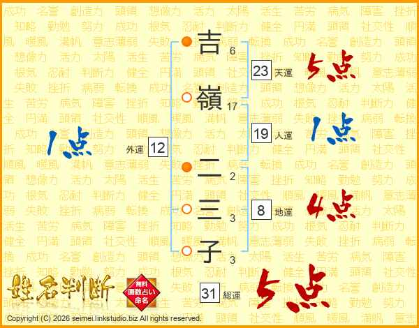 吉(6画)嶺(17画) 二(2画)三(3画)子(3画)
