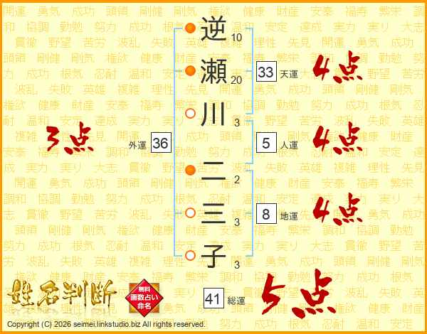逆(10画)瀬(20画)川(3画) 二(2画)三(3画)子(3画)