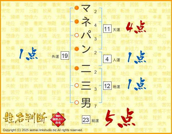 生活面を象徴する運勢です。外部から受ける影響力を表し、結婚運、家庭運や職場、環境への順応性を表します。総運から人運を引いた画数。姓や名が1文字の場合を除く。