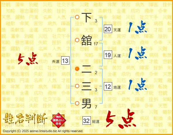 下(3画)舘(17画) 二(2画)三(3画)男(7画)