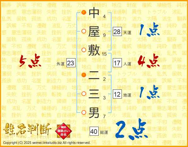 生活面を象徴する運勢です。外部から受ける影響力を表し、結婚運、家庭運や職場、環境への順応性を表します。総運から人運を引いた画数。姓や名が1文字の場合を除く。