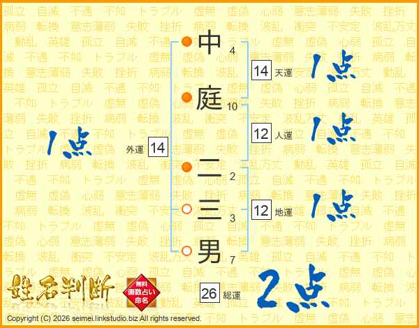 生活面を象徴する運勢です。外部から受ける影響力を表し、結婚運、家庭運や職場、環境への順応性を表します。総運から人運を引いた画数。姓や名が1文字の場合を除く。