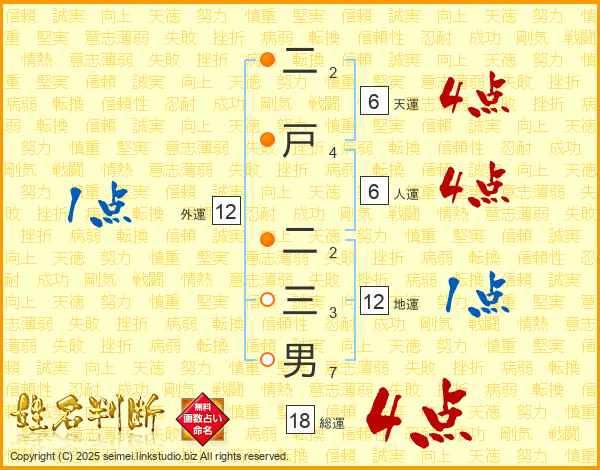 二(2画)戸(4画) 二(2画)三(3画)男(7画)