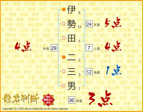 伊(6画)勢(13画)田(5画) 二(2画)三(3画)男(7画)
