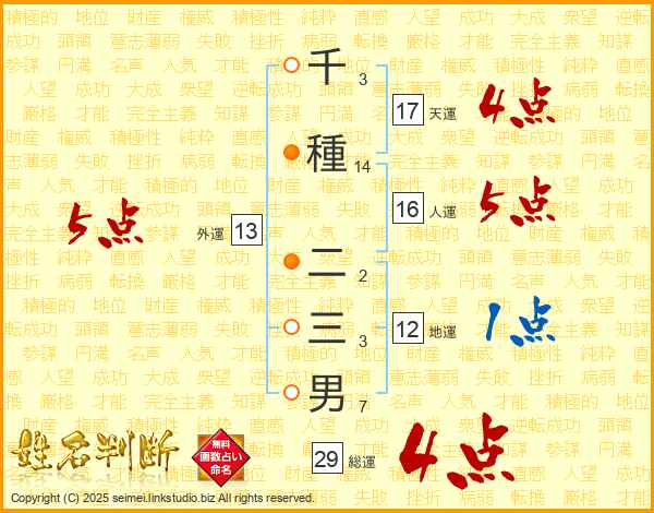 千(3画)種(14画) 二(2画)三(3画)男(7画)
