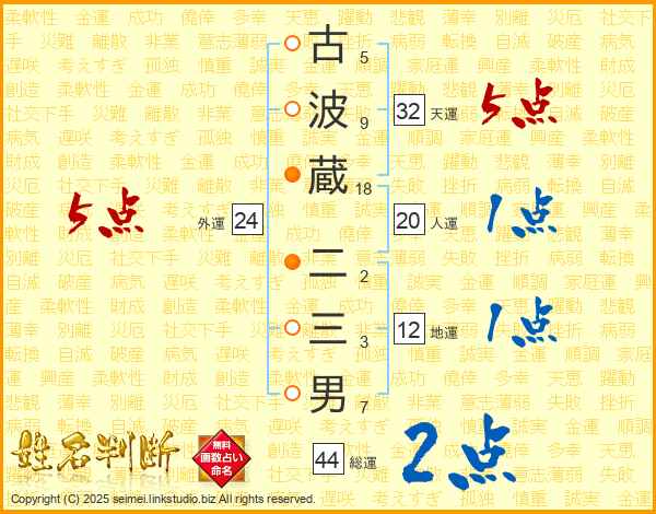 古(5画)波(9画)蔵(18画) 二(2画)三(3画)男(7画)