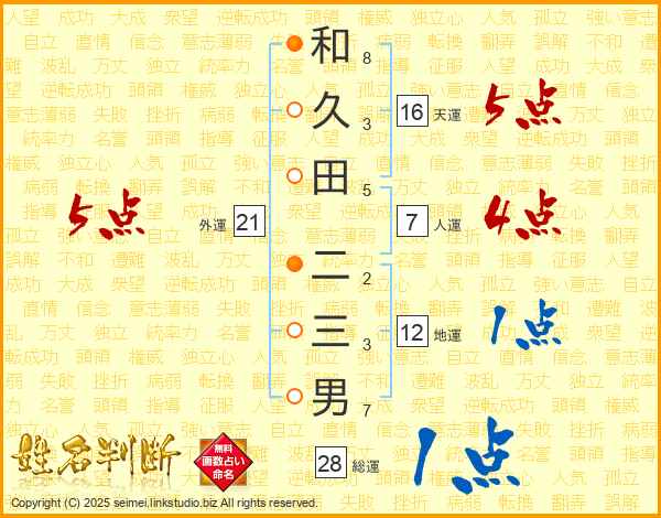 和(8画)久(3画)田(5画) 二(2画)三(3画)男(7画)