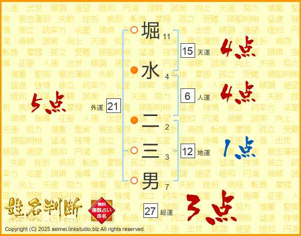 堀(11画)水(4画) 二(2画)三(3画)男(7画)