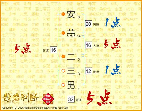 生活面を象徴する運勢です。外部から受ける影響力を表し、結婚運、家庭運や職場、環境への順応性を表します。総運から人運を引いた画数。姓や名が1文字の場合を除く。