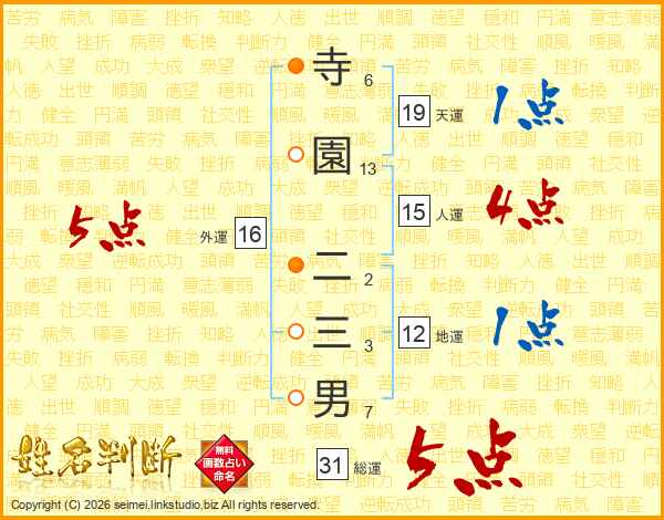 寺(6画)園(13画) 二(2画)三(3画)男(7画)