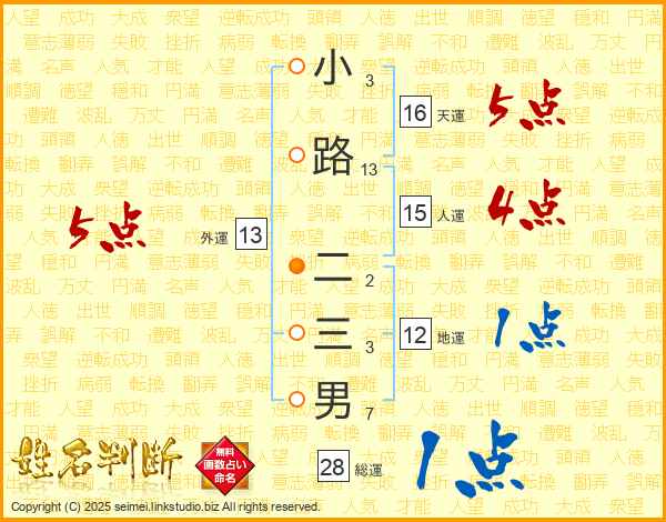あなたの人生を表す1番重要な運勢です。生涯を通じて影響する総合運となり、主に50歳以降の晩年期に影響を及ぼします。苗字と名前の合計画数。