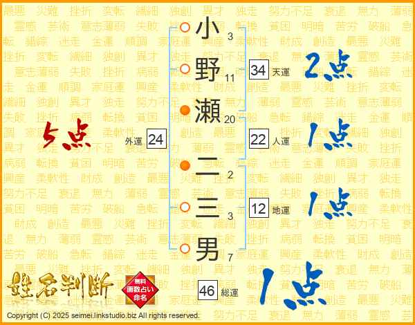 小(3画)野(11画)瀬(20画) 二(2画)三(3画)男(7画)