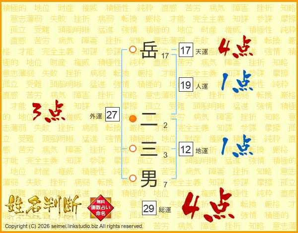 あなたの人生を表す1番重要な運勢です。生涯を通じて影響する総合運となり、主に50歳以降の晩年期に影響を及ぼします。苗字と名前の合計画数。
