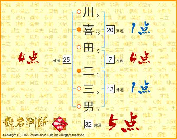 川(3画)喜(12画)田(5画) 二(2画)三(3画)男(7画)