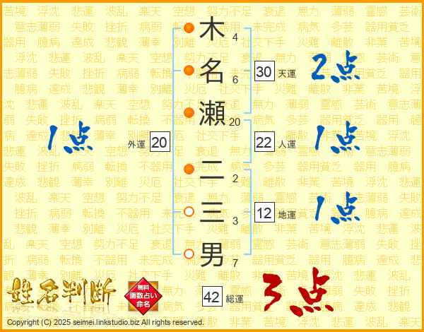 木(4画)名(6画)瀬(20画) 二(2画)三(3画)男(7画)