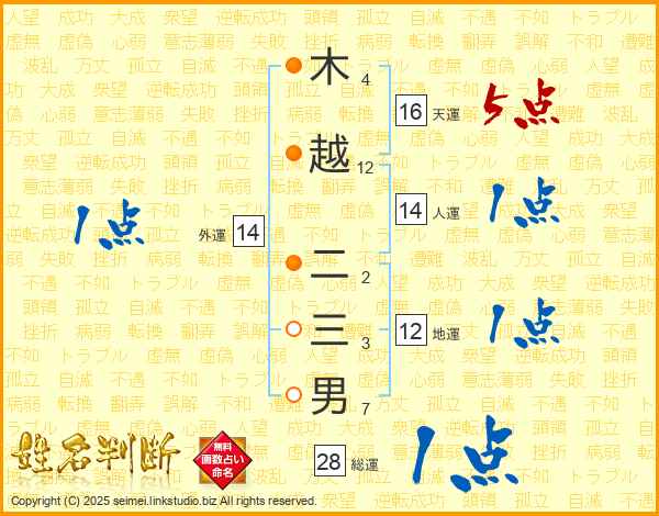木(4画)越(12画) 二(2画)三(3画)男(7画)