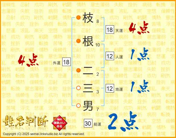 あなたの人生を表す1番重要な運勢です。生涯を通じて影響する総合運となり、主に50歳以降の晩年期に影響を及ぼします。苗字と名前の合計画数。