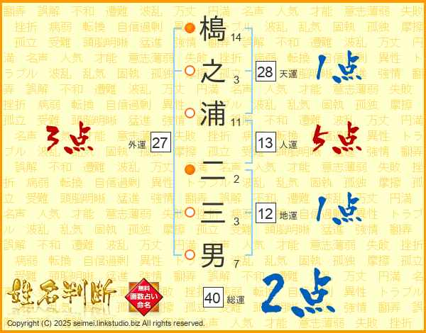 生活面を象徴する運勢です。外部から受ける影響力を表し、結婚運、家庭運や職場、環境への順応性を表します。総運から人運を引いた画数。姓や名が1文字の場合を除く。