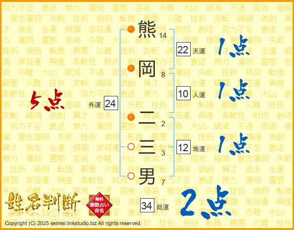 熊(14画)岡(8画) 二(2画)三(3画)男(7画)