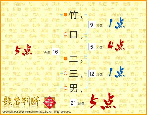 竹口二三男さんの総運は21画の5点!