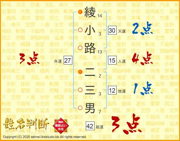 綾(14画)小(3画)路(13画) 二(2画)三(3画)男(7画)