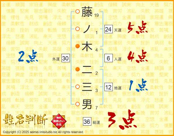 藤(19画)ノ(1画)木(4画) 二(2画)三(3画)男(7画)