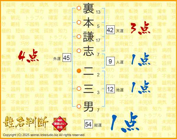 裏(13画)本(5画)謙(17画)志(7画) 二(2画)三(3画)男(7画)