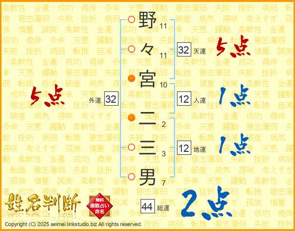 野々宮二三男さんの総運は44画の2点!