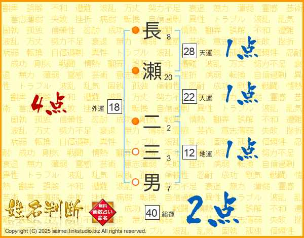 長(8画)瀬(20画) 二(2画)三(3画)男(7画)