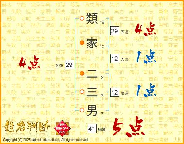 類家二三男さんの総運は41画の5点!