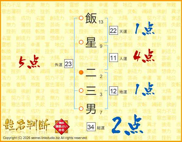 飯星二三男さんの総運は34画の2点!
