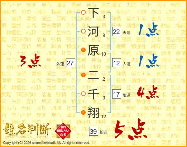 下河原二千翔さんの総運は39画の5点!