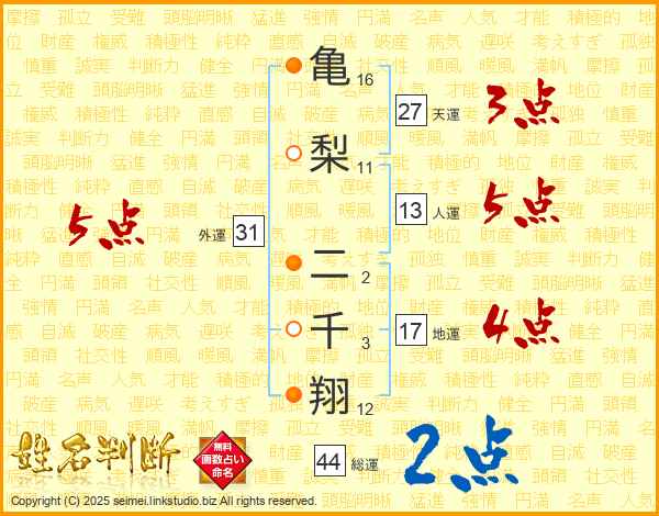 亀(16画)梨(11画) 二(2画)千(3画)翔(12画)