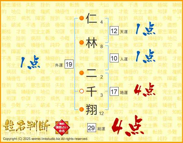 仁(4画)林(8画) 二(2画)千(3画)翔(12画)