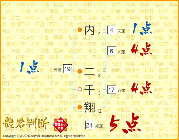 内二千翔さんの総運は21画の5点!
