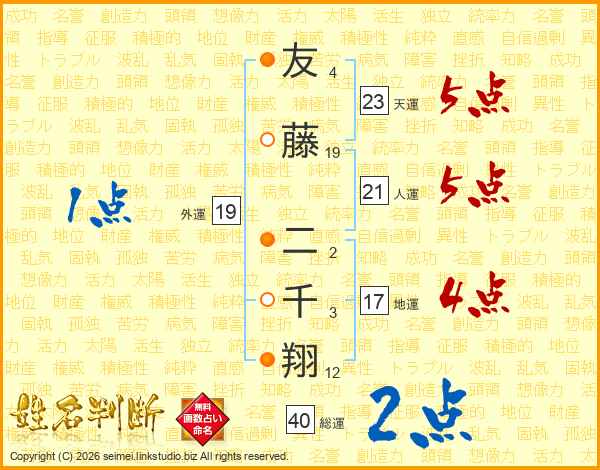友(4画)藤(19画) 二(2画)千(3画)翔(12画)
