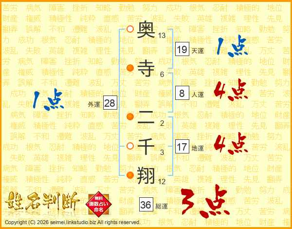 奥(13画)寺(6画) 二(2画)千(3画)翔(12画)