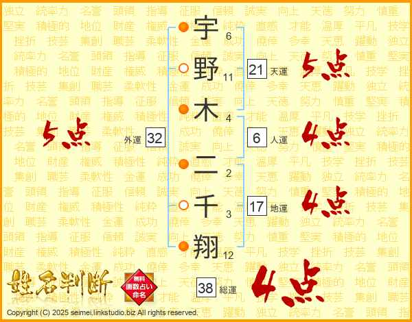 宇(6画)野(11画)木(4画) 二(2画)千(3画)翔(12画)