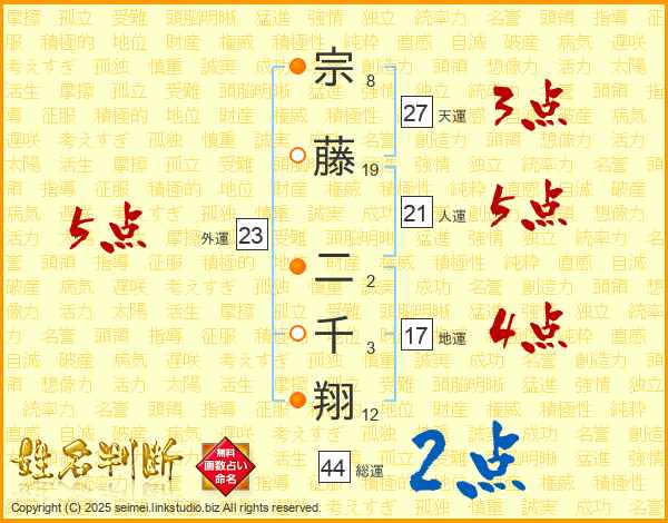 宗(8画)藤(19画) 二(2画)千(3画)翔(12画)