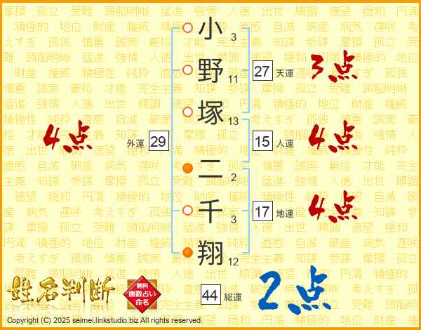小野塚二千翔さんの総運は44画の2点!