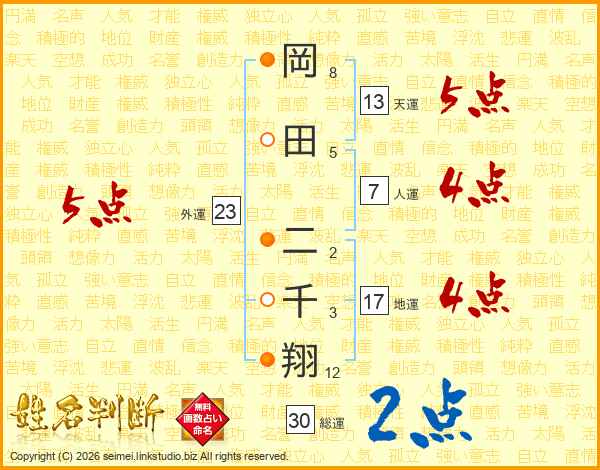 岡田二千翔さんの天運は13画の5点!