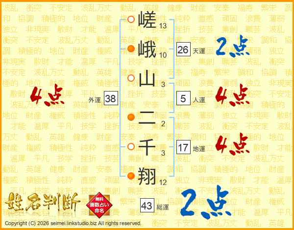 嵯(13画)峨(10画)山(3画) 二(2画)千(3画)翔(12画)
