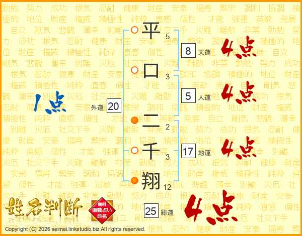 生活面を象徴する運勢です。外部から受ける影響力を表し、結婚運、家庭運や職場、環境への順応性を表します。総運から人運を引いた画数。姓や名が1文字の場合を除く。
