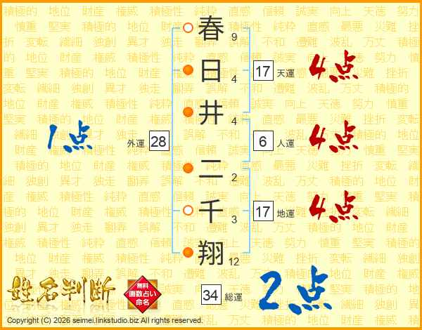 春日井二千翔さんの天運は17画の4点!