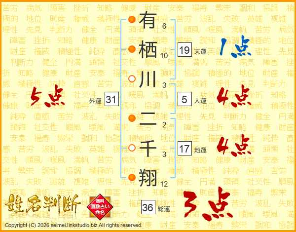 有(6画)栖(10画)川(3画) 二(2画)千(3画)翔(12画)
