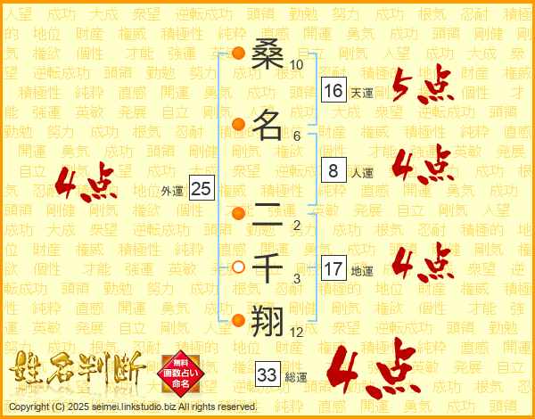 桑名二千翔さんの総運は33画の4点!