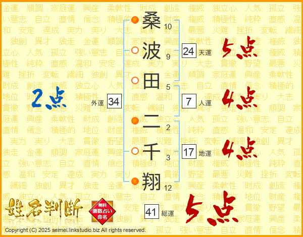 桑(10画)波(9画)田(5画) 二(2画)千(3画)翔(12画)